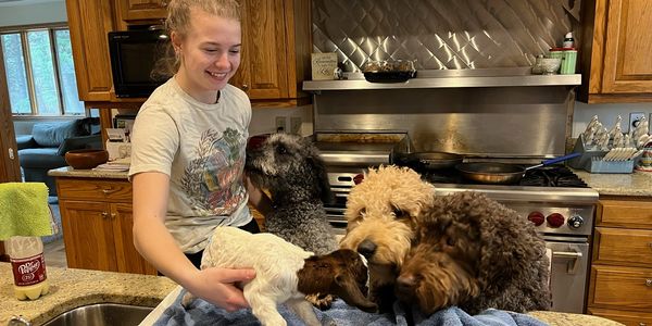 Training takes as little as 1 month but can take as long as 6 months. Once the puppy has met nearly all of my training criteria, I match the dog to a family.